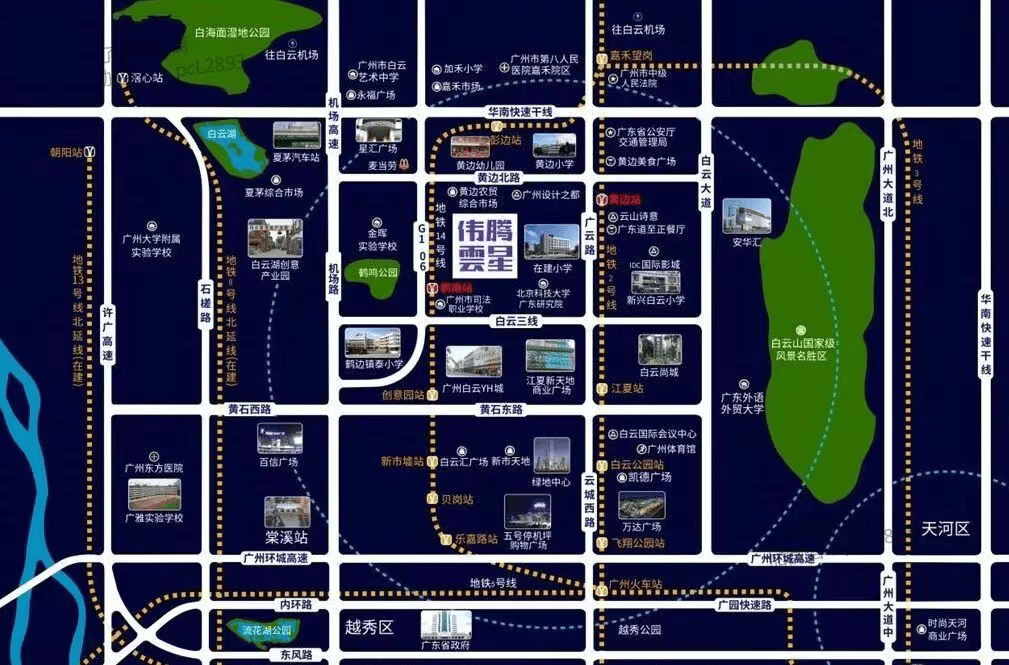 伟腾云星的区位价值,核心在于“交通枢纽+城市核心板块”的双重加持,地处广州白云区鹤龙一路,紧邻白云新城,坐享广州设计之都发展红利,同时凭借多维交通网络,实现高效通达全城的便捷生活。地铁出行方面,项目堪称“地铁上盖黄金物业”,周边规划有三条地铁线路,形成立体交通网络。其中,在建的14号线米,预计通车后可直达嘉禾望岗TOD、广州火车站,未来从项目出发,6站即可到达广州火车站,耗时不到20分钟;毗邻地铁2号线号线可直达白云文化广场、海珠广场等城市核心商圈,换乘3号线可快速抵达天河区、番禺区,30分钟内即可到达广州南站,轻松实现跨区通勤与异地出行。此外,地铁3号线嘉禾望岗站近在咫尺,进一步丰富了出行选择,实现“三地铁交汇”的便捷优势。